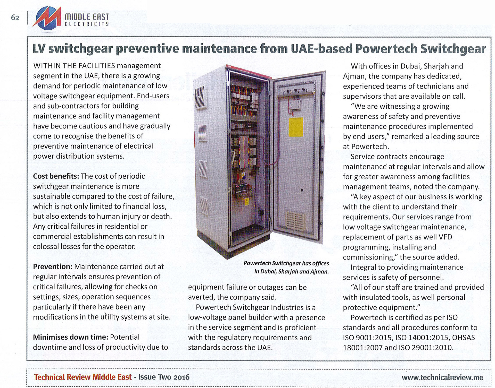 Powertech Switchgear was featured in magazine, Technical Review- Middle East Electricity 2016 edition. Key points discussed were growing demands in the facilities management sector for low voltage switchgear maintenance and new board requirements.